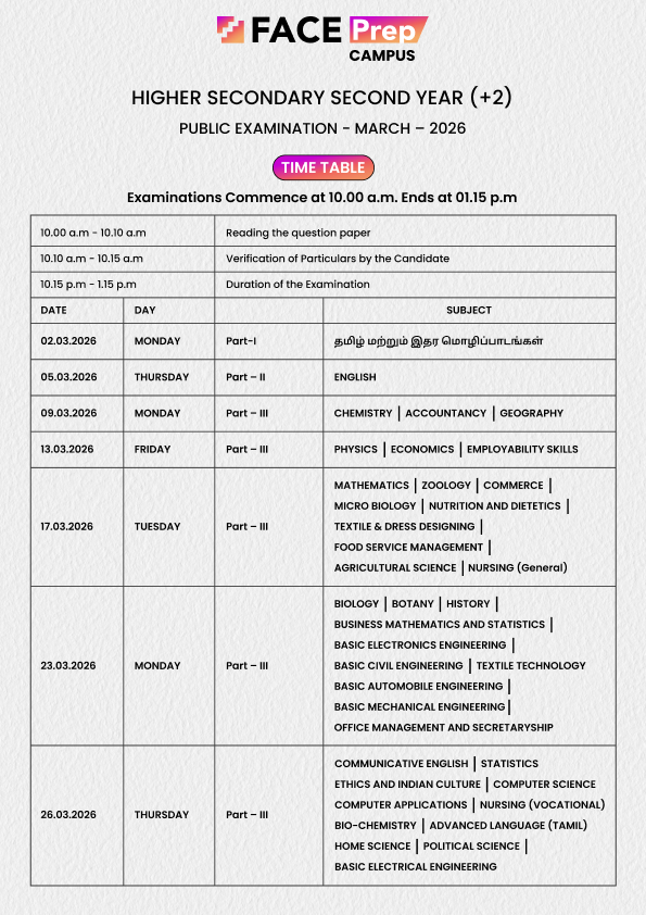Tamil Nadu +2 Exam Timetable 2026 :